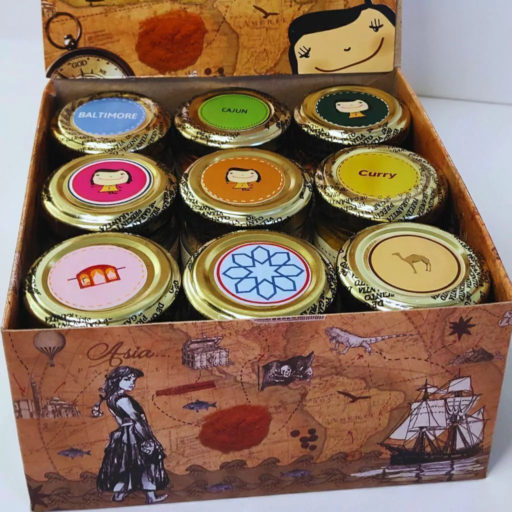 ¿Qué incluye esta fascinante caja? Nueve frascos cuidadosamente seleccionados, donde cada mezcla de especias cuenta su propia historia. En su interior encontrarás:
