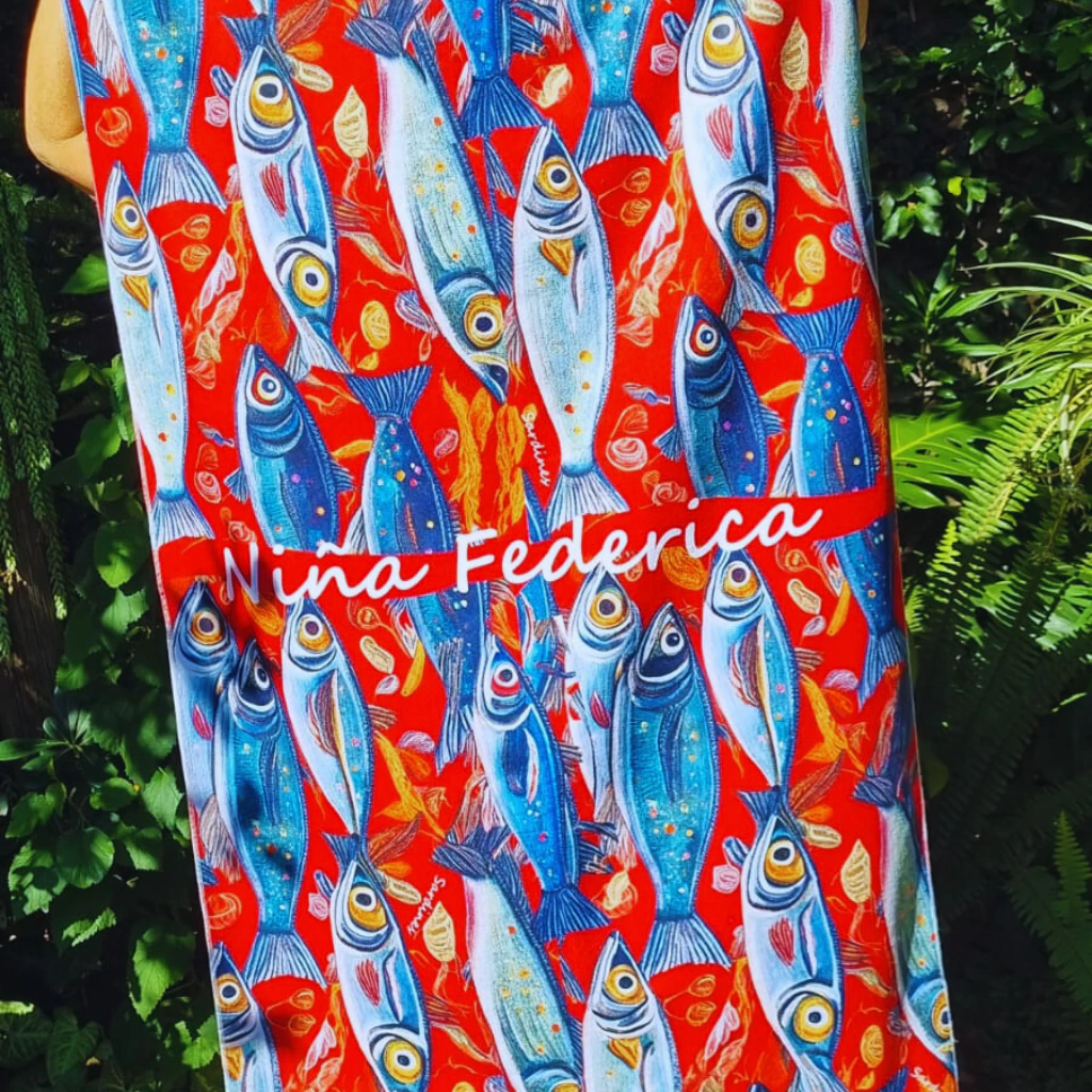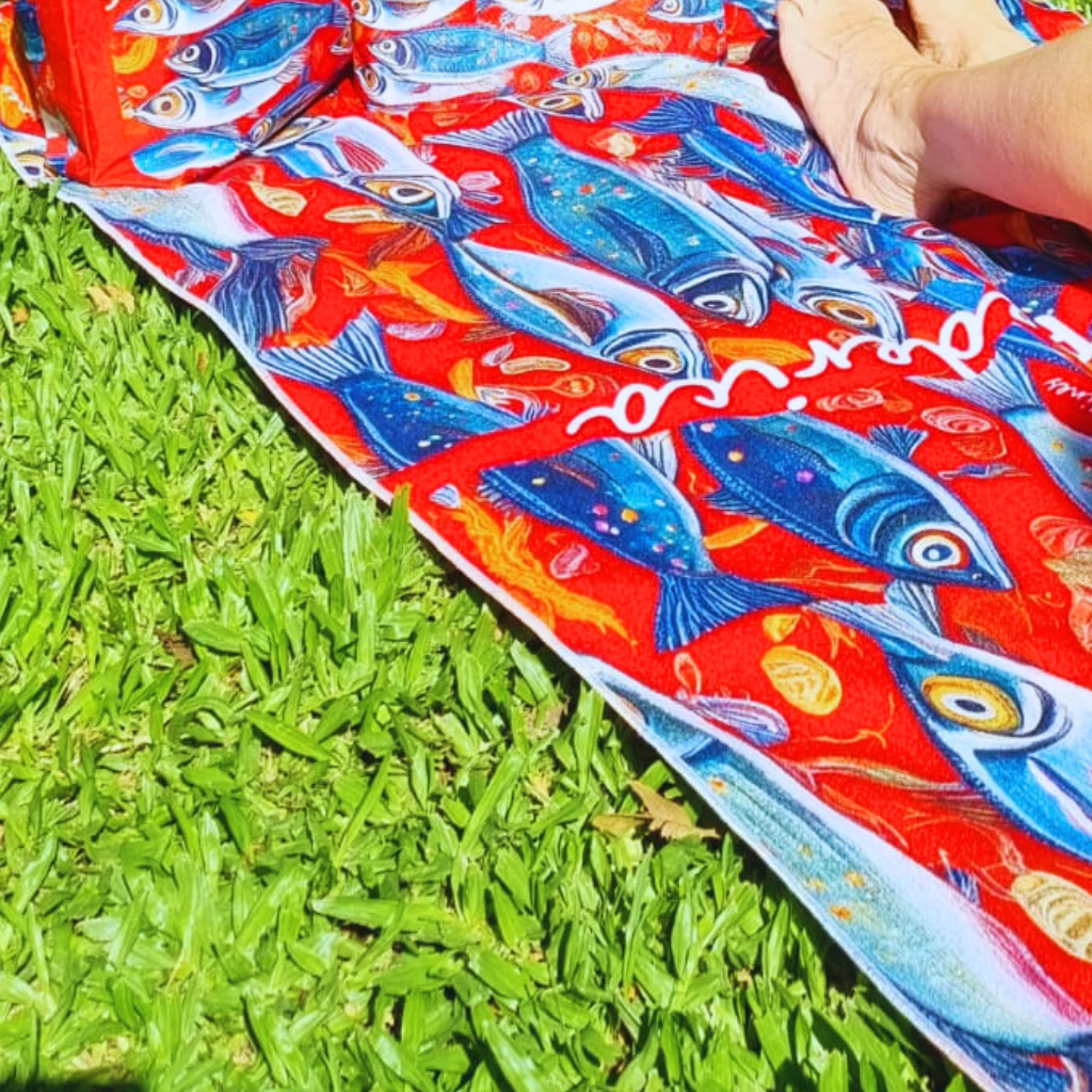 Toallón playero “Sardinas Portuguesas”. Medidas: 1,50 m x 75 cm En material toalla microfibra de calidad.